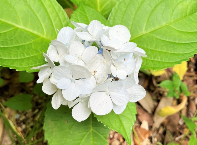 透析室前の庭では、ピンク、紫、白、ブルー、色とりどりの紫陽花が満開です。